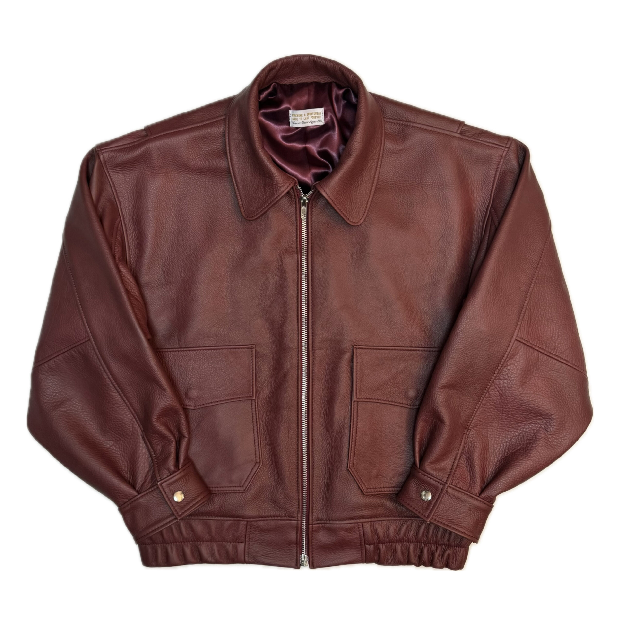Burgundy leather bomber jacket made in Athens. Outer is made from Italian cowhide leather silk lining. It features two outer pockets, YKK zipper, heavy duty leather cuff and waist bands.